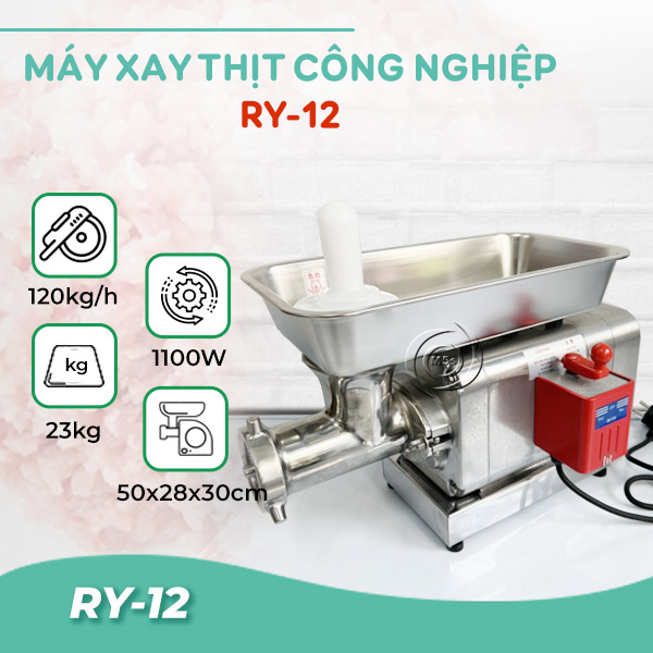 - RY-12 cho năng suất xay thịt cao, mỗi giờ có thể xay tối đa 100 đến 120kg thịt. Thành phẩm sau khi xay sẽ nát và đều nhau, sẵn sàng đáp ứng nhu cầu cung cấp số lượng lớn tại chợ, nhà hàng, quán ăn hay là siêu thị,....